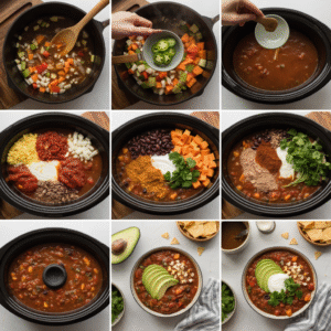 - Load the slow cooker: Add crushed tomatoes, diced tomatoes, tomato paste, vegetable broth, black beans, kidney beans, pinto beans, corn, sweet potato, chili powder, cumin, smoked paprika, oregano, cocoa powder, and any optional chipotle or bay leaf.