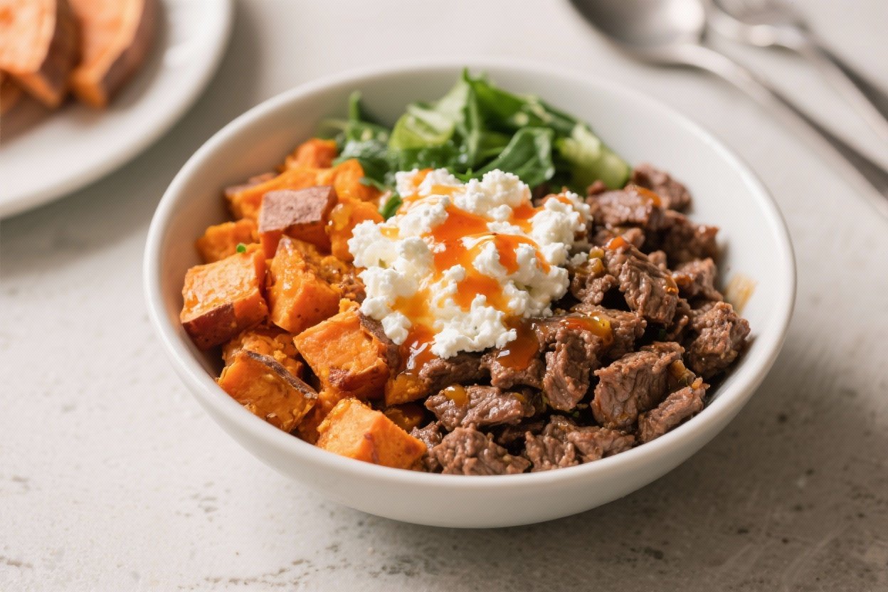 This Hot Honey Cottage Cheese Sweet Potato Beef Bowl brings comfort and energy in one easy recipe.