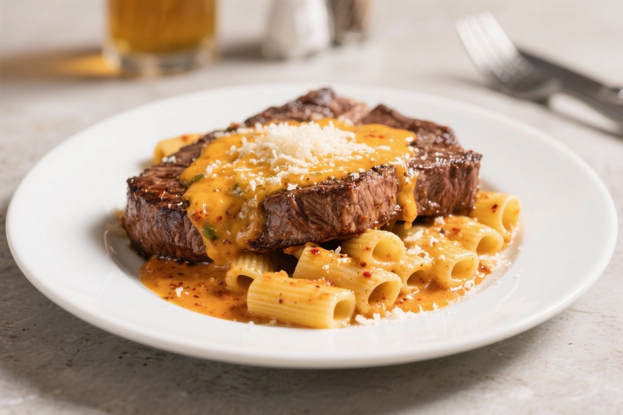 - Blue cheese finish: Crumble a little blue cheese over the steak for a sharp contrast to the creamy pasta.