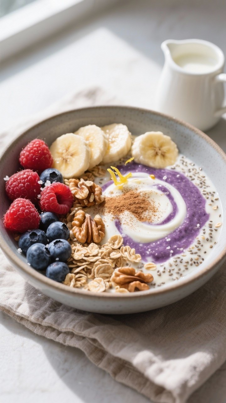- Apple Pie Bowl: Swap berries for diced apple, add extra cinnamon and a pinch of nutmeg, and top with walnuts and raisins.
