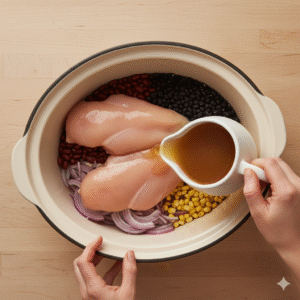 - Add the chicken and broth: Nestle the chicken breasts or thighs on top. Pour in the chicken broth. Give it a quick stir so the spices distribute.