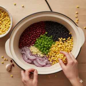 - Prep the base: Add the diced onion, minced garlic, rinsed beans, green chiles, and corn to your slow cooker.Sprinkle in cumin, chili powder, oregano, coriander (if using), cayenne (if using), and a generous pinch of salt and pepper.